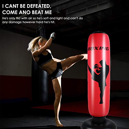 Details: Description: Our punching bag is made from 0.3mm thickened PVC material, reliable and won't leak, durable enough to withstand your hardest kicks and punches, then respond quickly by bouncing back up immediately. Just fill the lower chamber with sand or water, inflate the upper chamber and start to exercise! Specification: Item Name: Inflatable Punching Bag For the Crowd: Adult Material: 0.3mm PVC Color: Red Product Size: About 170x60x60cm / 66.9x23.6x23.6" How To Use: 1. Fill the lower chamber with water/sand and close the valve; 2. Inflate the upper chamber with air and close the valve. Notice: 1. Do not use high-pressure air to inflate. 2. Don't over inflate. Package Including Package Includes: 1 x Punching Bag